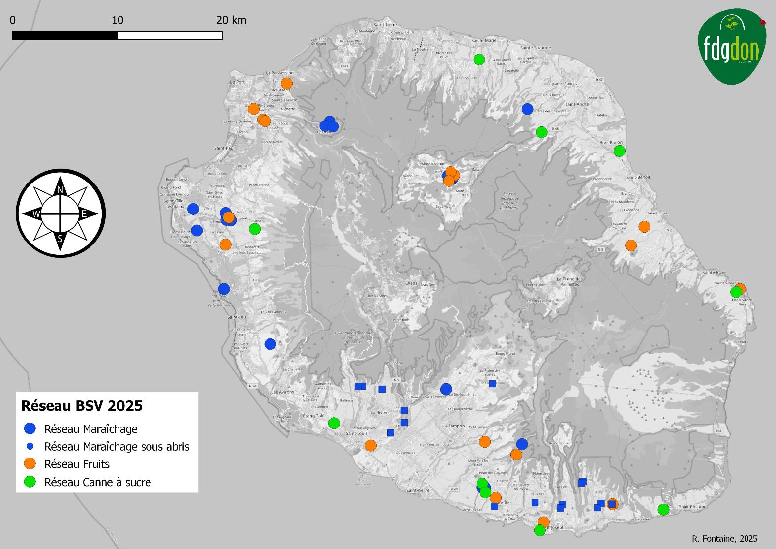Les agriculteurs alertent les agriculteurs Pour ce faire, ils se basent sur le Réseau d’épidémiosurveillance (RES) mis en place et coanimé par la FDGDON, la Chambre d’agriculture et la DAAF de 2009 à 2024. Depuis début 2025, Le RES est désormais porté seul par la FDGDON-Réunion, sous la supervision de la DAAF-Réunion. Les observations sont réalisées sur une cinquantaine de parcelles de références et plusieurs centaines de parcelles ponctuelles en partenariat avec 16 Organisations de Producteurs et instituts techniques : La FDGDON Réunion intervient dans l’animation interfilière et dans l’identification des problèmes phytosanitaires via sa Clinique du Végétal® située à Saint-Pierre dans le pôle de Protection des Plantes (3P). Mobilisons-nous pour une Agriculture saine et durable :