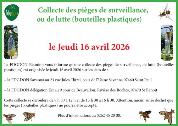 La FDGDON-Réunion vous informe qu’une collecte des pièges de surveillance, de lutte (bouteilles plastiques) est organisée le jeudi 16 avril 2026 de 8 h 30 à 12 h et de 13 h 30 à 16 h 30 sur les sites de : – la FDGDON Savanna au 23 rue Jules Thirel, cour de l’Usine Savanna 97460 Saint-Paul – la FDGDON délégation Est au 9 cour de Beauvallon, Rivière des Roches, 97470 Saint-Benoît Attention, aucun autre déchet que les pièges (bouteilles plastiques) ne pourra être accepté. Plus d’informations au 0262 45 20 00. |